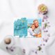 Nautical Boutique Co.'s minimalist Seas & Greetings foil holiday card design features modern hand-written script typography, your favourite portrait photo (5x7 ratio), and watercolor starfish accents for a fun tropical beach holiday theme. The design is set on an aqua teal watercolor swatch background. #SeasAndGreetings #HolidayCards #TropicalHolidays