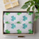Tissue paper printed with original textured watercolor shamrock pattern in tela green on white background.