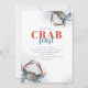 This design features a simple watercolor blue crab feast invitation with a QR code for website, with a Facebook icon for party event page, online URL with a nautical crab boil bake party, a coastal living seaside ocean sea, great for seafood dinner party event invitation, a stylish trendy typography font text, a modern calligraphy script typography, with a Maryland New England Maine coast style, whimsical crab legs boiled baked, an elegant stylish fun water ocean, with a crustacean red blue animal marine