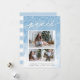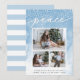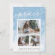 Share holiday greetings with these chic Christmas photo cards featuring three of your favourite photos (1 landscape, 2 square) arranged in a rectangular collage layout on a pale blue watercolor wash background accented with falling snow. "Peace" appears at the top in elegant hand lettered script typography. Personalise with your custom holiday greeting, name(s) and the year along the bottom. Cards reverse to a stripe pattern in matching pastel blue and white.