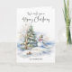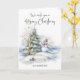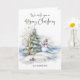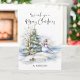 Sweet smiling snowman with pine tree and decorated bare tree with Merry Christmas calligraphy. Message inside.