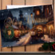 Holiday Christmas town photo card. Watercolor design with a vintage feel. Evening winter scene of an old Victorian town decorated for the holidays. Get into the holiday spirit with our cosy golden watercolor Christmas town photo card! Share the joy this season with a touch of magical charm.