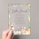Hop into spring with our adorable Watercolor Spring Bunnies Easter brunch invitations, perfect for inviting guests to your Easter Sunday celebration! These charming invites showcase your event details surrounded by a whimsical frame of blue and yellow flowers, lush green foliage, playful bunnies, and a basket brimming with colourful Easter eggs. Choose between a frosted or transparent acrylic background to complement this delightful design. Personalise the invitations with your brunch details to create a festive and memorable way to gather friends and family for your Easter celebration!