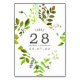 Trendy green and white autumn spring wedding table number cards customisable to your event specifics.