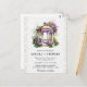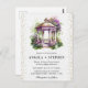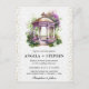 Watercolor Spring Garden Gazebo design with beautiful purple flowers on white lace background and gold glitter confetti