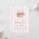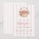 This design features a charming hand-painted watercolor illustration of a woven wicker basket filled with ripe red strawberries, white blossoms, and greenery, tied with cute pink bows. The artwork is set on a background of soft pink and white vertical stripes, creating a sweet, vintage cottage feel perfect for a little girl on the way.