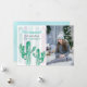 Lovely pastel cactus Christmas holiday design. Design features a white background with pastel watercolor stripes in blue, green, pink and purple. There are two cacti at the bottom of the design. Each cactus is decorated with strings of pastel coloured Christmas tree lights. At the top of the design is a light blue banner with the words Feliz Navidad in teal font. Below the Feliz Navidad banner is customisable text in grey and teal font where you can add your Christmas holiday message and your name. To the right is a place to add your holiday photo. The reverse side of the Christmas card is covered in a teal blue watercolor. This pretty and unique Christmas card design is perfect for sending your holiday greetings.