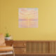 Artwork of a watercolor painting style sunset over the ocean. Capturing the moment of "golden hour," this piece features a soft, glowing sun dipping toward a tranquil horizon. The sky is awash in dreamy hues of apricot, pale yellow, and soft lavender, reflecting gently off the calm waters below. Distant purple mountains ground the composition, adding depth to the endless horizon. With its nostalgic, hazy aesthetic, this design captures the perfect ocean sunset. The soft, bleeding edges of the watercolor medium give it a vintage feel.