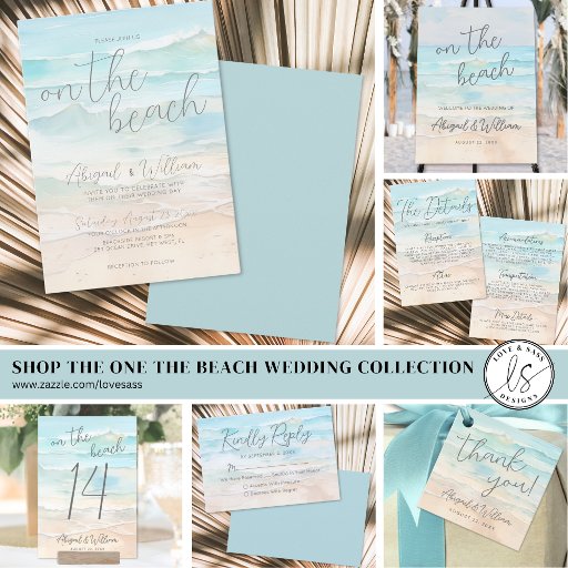 Simple Seaside Watercolor Summer On The Beach Wedding Invitation. A calming blue and tan beach watercolor background sets the stage for an elegant seaside wedding. The background is a watercolor beach scene with a close up of the shore as it meets the ocean waves. It's not an over the top and literally interpretation, but a slightly abstract coastal setting. Sweet script typography leads off with the 'on the beach' saying and continues throughout the invitation. Mixed with a simple modern font for an elegant but laid back and casual vibe. The fonts are a dark grey colouring, but you can change them to whatever you'd like.