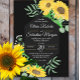 Design features a bouquet of watercolor yellow sunflowers, eucalyptus and others leaves and twigs on black background