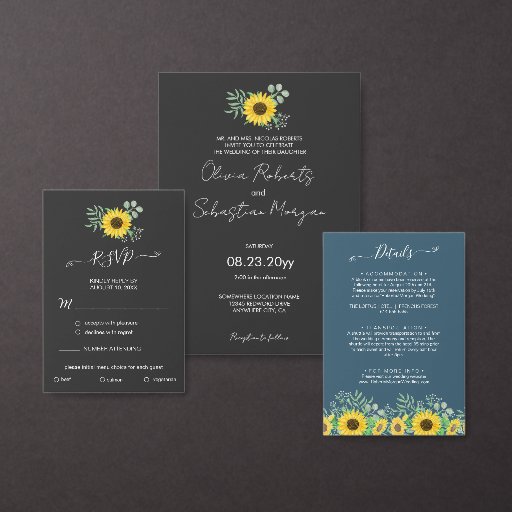 Design features a bouquet of watercolor yellow sunflowers, eucalyptus and others leaves and twigs on white background