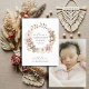 Cute watercolor teddy bear floral wreath birth announcement, and sweet baby photo on the other side.