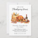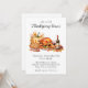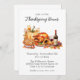 This custom invitation features an elegant Thanksgiving dinner theme. A watercolor style image of various food and florals from a Thanksgiving dinner is placed in the centre. A roasted turkey is placed between an apple pie and bottle of wine. A festive pumpkin and fall foliage is placed behind the feast.