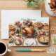 Watercolor illustration of a beautifully arranged Thanksgiving feast on a wooden dining table. The centerpiece is a roasted turkey surrounded by an array of colourful dishes. Small decorative pumpkins accent the table, and there are candles providing a warm glow. The table setting includes plates, silverware, and glasses, creating a cosy, festive atmosphere. Designed by artist Danguole Serstinskaja
