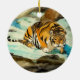 The tiger crouches in the snow, perhaps observing some movement in the brush, or lapping up a cool winter drink