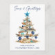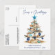 Modern Minimalist Elegance Calligraphy Ink Pen Handwritten Script Seas & Greetings Coastal Holiday Postcard includes a Watercolor Christmas Tree make of beach ocean driftwood, seashells, sand dollars, nautical anchor ornament and topped with a starfish. Navy Blue Text.