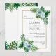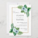Beautiful wedding invitation design featuring watercolor blue hibiscus flowers and tropical leaves on a white background with a golden frame. Perfect wedding invitation style for tropical, destination and beach weddings.