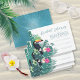 Colourful bridal shower invitation featuring a corner ornament with a bold toucan sitting among watercolor hibiscus blooms and palm leaves. The white background is optional and can be changed if preferred. Reverse has a repeating, palm leaf pattern in shades of teal. These tropical cards are perfect for summer, beach and tropical weddings, birthdays and other events. Search ID577 to see matching products.