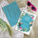 Colourful couples shower invitation featuring a teal frame and a border with a bold toucan sitting among watercolor hibiscus blooms and palm leaves. Reverse has repeating, palm leaf pattern in shades of teal. Add your event details using the provided template. These are perfect for summer, tropical and/or destination events. Search ID577 to see matching products.