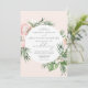 This elegant wedding invitation features a white circle surrounded by a watercolor illustration of lush pink flowers and green tropical foliage on a blush pink background. Customise the charcoal grey text with your wedding details. The reverse side is a coordinating shade of solid blush.