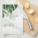 This personalised contemporary summer themed kitchen towel is modern and stylish, with a clean minimal design featuring watercolor tropical leaves and trendy handwriting script.