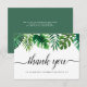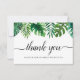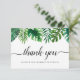 Modern tropical wedding thank you card design featuring watercolor green monstera and palm leaves illustration on a simple white background. Reverse side of the invitation is in deep green colour.