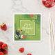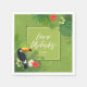 Colourful wedding paper napkin design featuring a square, spring green frame with corner borders of a bold toucan sitting among watercolor hibiscus blooms and palm leaves. The repeating, palm leaf background pattern is optional and can be changed to white if preferred. These tropical napkins are perfect for summer, beach and tropical weddings, birthdays and other events. Search ID577 to see matching products.