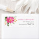 A bright, colourful and modern return address label featuring a large bold spray bouquet of watercolor flowers in tropical pink, orange and green. Your name is in fuchsia pink, and address in black.