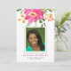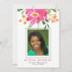 A bright, colourful and modern graduation announcement featuring a large bold spray bouquet of watercolor flowers in tropical pink, orange and green. In the centre is a photo of the graduate with a thin green frame. Underneath the photo guest is the name of the graduate in fuchsia pink, and graduation details in black at the bottom of the announcement. The back of the invitation is in solid green.