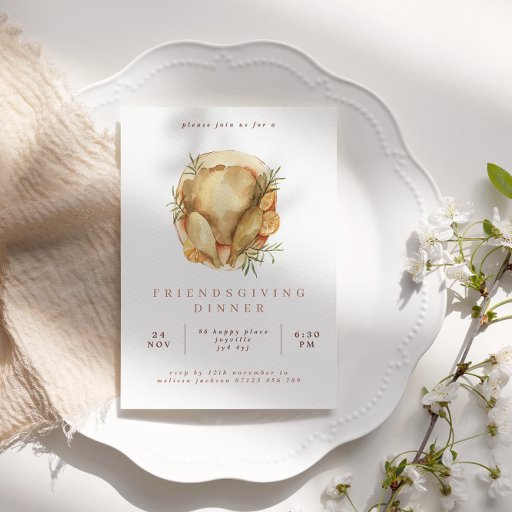 A beautiful and elegant Thanksgiving invitation featuring a watercolor illustration of a roasted turkey with trimmings.