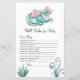 Girl Teal Dragon Pink Clouds Well Wishes for Baby Game. This lovely well wishes card is great for many occasions such as baby showers, birthday parties, new babies, christening, baptisms, and more. It features a little whimsical green dragon with pink wings on a blue cloud, surrounded by natural elements such as stones, clouds, and plants in pastel colours of pink, blue, and green. To alter texts, further rearrange them, and format their style and placement, just click the customise it button. Matching items available in store.
