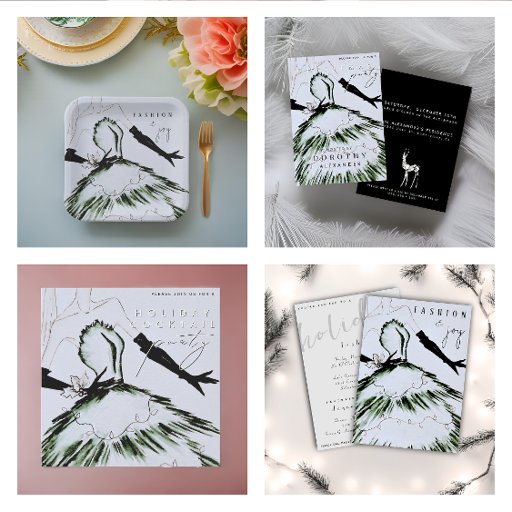 A hand painted watercolor fashion model wearing a christmas tree gown and black gloves on a stylish holiday fashion show invitation