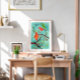 Watercolor Wall Art Birds, a watercolor design with a red couple of birdcows finish, with green and blue background, a poster to decorate those special spaces of your home, with cheerful colors to highlight that wall of your home.