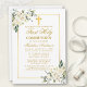 Elegant Watercolor White Floral First Holy Communion Invitation includes white roses and greenery. Gold Frame. Gold Cross.
