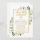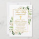 Modern Elegant Watercolor White Floral First Holy Communion Invitation includes white flowers, eucalyptus leaves and other beautiful botanical greenery foliage. Gold Cross.