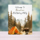 A serene watercolor wilderness scene unfolds amidst majestic mountains, tranquil trees and a peaceful campfire, while a curious moose roams free. The perfect backdrop for an adventure-filled celebration.