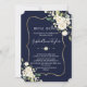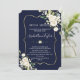 Elegant card design featuring watercolour delicate white flowers and green leaves, a faux gold frame, floral divider, on a dark blue background. On the back white flowers bouquet. Use Personalise tool to add your info, change fonts, font's colours. For matching items, please, visit my Delicate White Flowers Collection.