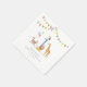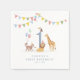 Watercolor party napkins featuring wild safari animals, including a lion, giraffe, monkey, and festive details inspired by the popular Wild One first birthday theme. Soft watercolor illustrations and cheerful colors create a playful yet charming look perfect for a child’s first birthday celebration.