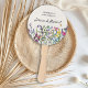 Colourful watercolor wildflower / on ivory cream and purple botanical outdoor wedding hand fan to help your guest stay cool. Personalised with a "thank you for coming" from the bride and groom.