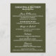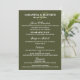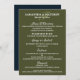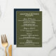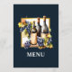 Three ai watercolor wine bottles are resting on a wooden board that has bunches of red grapes on it with vine leaves. The graphic is framed by a white square inlay edged with faux gold and pops against a dark blue background. The reverse is a forest / olive green green colour with white templates for your custom food choices. This menu is ideal for any cheese and wine cocktail party; for a winery / vineyard / wine farm wedding or a rustic country outdoor birthday or retirement party.
