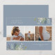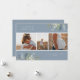 Pretty watercolor winter greenery arrangements, three photo holiday card. Card features, winter greenery in soft shades of blue and green with dusty blue colour backgrounds. Template provides two spaces for your custom text and three photos.