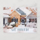 Hand painted look of watercolored portrait of home. Deliver the news of your move with artistic panache. A modern home blanketed with snow . Colours of hazelnut brown with storm grey in a white backdrop for your new address announcement.