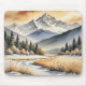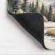 Snow-capped mountains rise majestically in the background, overlooking a serene landscape of pine trees, frozen river, and frosted grass