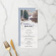 A beautiful watercolor Winter snow landscape wedding design. A unique design that features watercolor evergreen pine trees in the snow with a beautiful landscape in the background. An elegant design with snow mountains and trees. A Winter snow themed wedding menu card design with modern dusty blue elements. Matching wedding invitations and other stationery items are also available.