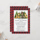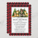 Watercolor Woodland Animals Baby Shower Invitation. Baby Animals include Bear, Deer, Moose, Racoon, Bunny Rabbit, Fox and Owl with a backdrop of pine trees. Forest Green Pine, Red Buffalo Plaid.