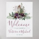 Beautiful watercolor woodland forest rustic "welcome to our wedding" sign with bear, green and burgandy flowers and folliage. Very light gray faux linen background. Great for a fall or winter wedding
