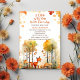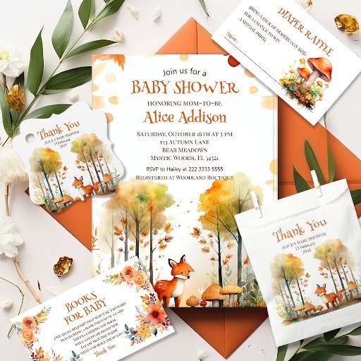 A whimsical baby shower invitation card with a cute fox in autumn woodland scenery on the front and an elegant floral pattern on the back. This beautiful card is created with love for you and your soon-to-be little adventurer. Designed to complement indoor or outdoor baby showers adorned with autumn scenery, wildflowers, mushrooms and a very cute woodland fox!