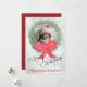 This beautiful Christmas card features a hand painted watercolor design with your photo inside of a green pine wreath with red berries and a big red bow on a marbled pale green background. There is elegant script lettering reading Merry Christmas, and space for your note/signature below.