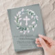 CLEAR ACRYLIC INVITATIONS! These modern, elegant first communion invitations feature a beautiful watercolor wreath of sage green leaves and silver-grey flower buds around a pale pink cross, ideal for your daughter's special occasion. MATCHING items available in our collection.