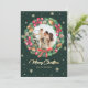 Elegant green photo Christmas card featuring a photo inside by a watercolor wreath of berries, holly, pine cones, conifer tree branches, and poinsettia flowers on a dark green background with a gold hand-lettered script font title, snowflakes and falling snow. Easily personalise this watercolor photo Christmas card with your image, a family name and text. The background colours can be changed to any colour.
